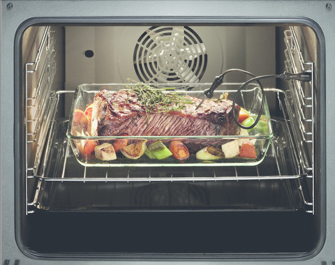 In an oven with a core thermometer, you can roast meat exactly the way you like it. Put the sensor in a piece of meat and it'll measure the exact core temperature. That way, your steak won't be too well done.