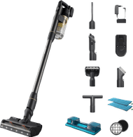 With the Philips SpeedPro Aqua FC6728/01, you get a powerful vacuum, handheld vacuum, and mop all in one. Thanks to the PowerCyclone 7 motor, you vacuum up to 50 minutes in the lowest setting. The battery lasts 22 minutes in the turbo mode, which you use for carpets. The 180-degree attachment vacuums dirt from the front and sides and illuminates the floor with LED lighting. The suction part moves towards the ground, while the back moves upwards. So you see exactly where there's dirt and vacuum in both directions. To clean extra thoroughly, you click the attachment with integrated mop system on the vacuum. With the suction brush, you remove dirt and dirty stains from the floor right away with the mopping function. After use, you easily wash the microfiber cloths in the washing machine.