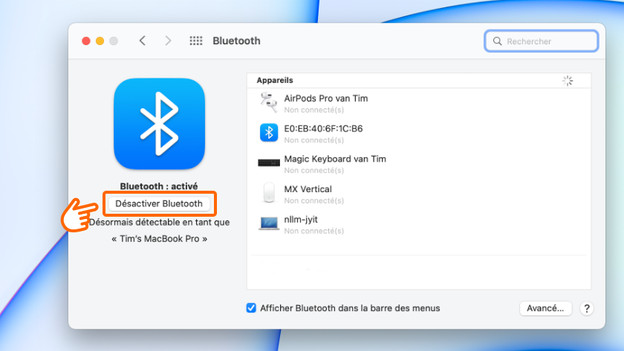 Désactivez la connexion wifi et Bluetooth lorsque vous ne les utilisez pas. C'est pratique, par exemple lorsque vous voulez regarder des films sur votre Apple MacBook pendant un long vol en avion. Les connexions sans fil consomment également de l'énergie lorsque vous ne les utilisez pas. En les désactivant, la batterie de votre MacBook se décharge moins rapidement. Pour désactiver Bluetooth, cliquez sur l'icône Bluetooth dans Préférences système, puis sur Désactiver Bluetooth. Désactivez le wifi dans Réseau.