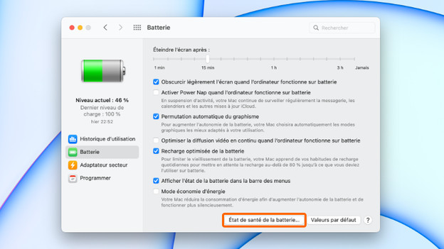 MacBook tient plus longtemps si vous modifiez les paramètres de la gestion de l'alimentation. Cliquez sur l'icône de la batterie en haut à droite de l'écran, puis cliquez sur Ouvrir les préférences d'énergie et sélectionnez Permutation automatique du graphisme. Désactivez aussi le Power Nap. MacBook ne vérifiera ainsi plus les mails entrants et les mises à jour lorsqu'il est en mode veille.