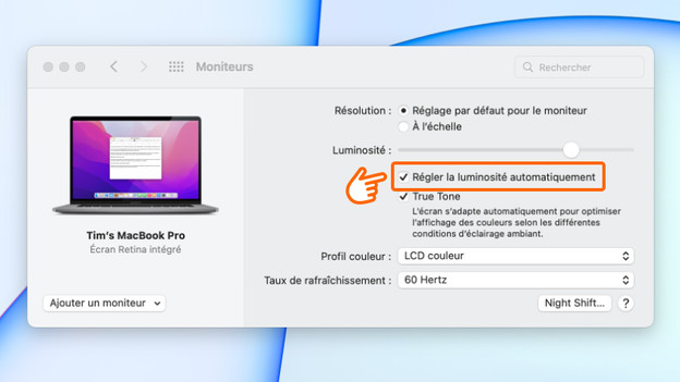 Aussi bien l'écran que le clavier de votre MacBook sont éclairés. Plus la luminosité est élevée, plus votre MacBook consomme. Votre Apple MacBook tient donc nettement moins longtemps lorsque la luminosité de l'écran est toujours à 100 %. Utilisez les touches de fonction pour régler la luminosité. Sur certains MacBook Pro, il est possible de régler cet aspect avec la Touch Bar. Allez aussi dans les Préférences système du MacBook pour désactiver le réglage automatique de la luminosité en fonction de la lumière ambiante.