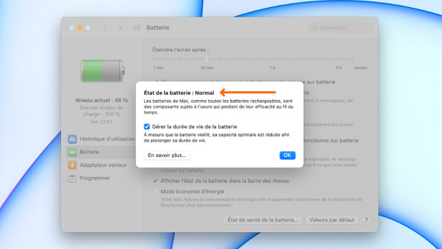 La batterie de votre MacBook se vide rapidement malgré ces astuces ? Alors, il faut peut-être remplacer la batterie. Il est possible de vérifier si c'est le cas dans macOS. Cliquez sur la batterie en haut à droite de l'écran et ouvrez Préférences de la batterie. À gauche de la fenêtre de la 'Batterie', cliquez sur Batterie. Maintenez, cliquez sur l'État de la batterie à droite en bas de l'écran. Si la batterie doit être remplacée, vous le verrez dans ce menu. Si vous préférez ne pas remplacer la batterie, envisagez l'achat d'un nouvel Apple MacBook.