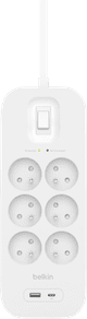 La multiprise Belkin Parafoudre avec USB-C 6 Prises vous permet de charger tous vos appareils. La multiprise dispose de 6 prises, d'un port USB-A et d'un port USB-C avec Power Delivery. Ainsi, vous pouvez par exemple charger votre téléphone très rapidement. La multiprise dispose également d'un interrupteur Marche/Arrêt. Grâce aux prises mises à la terre, la multiprise convient aux appareils qui présentent un grand risque de court-circuit. De plus, cette multiprise Belkin dispose d'une protection surcharge jusqu'à 650 joules, ce qui réduit le risque d'endommager vos appareils. Les voyants lumineux indiquent si vos appareils sont protégés et si vous devez remplacer le parasurtenseur.
