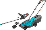 Entretenez tout votre jardin grâce au Gardena PowerMax 32/18V P4A Solo + Gardena EasyCut 45/18V + Bosch Kit de Démarrage 18 V 4,0 Ah. L'ensemble inclut une tondeuse à gazon, un taille-haie et une batterie.