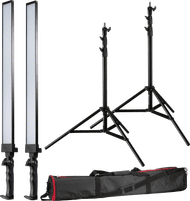 Twee vrij smalle hoge lichten om bijv in een kleine studio een greenscreen uit te lichten. Neemt vrij weinig ruimte in, zeker vergeleken met softboxen. Omdat het LED balken in aluminium armaturen zijn, worden deze niet meer dan handwarm. Veel licht, en te dimmen naar wens. Kleurechtheid prima, kleur temp is niet aan te passen. Alleen op 230 Volt, geen accu's.