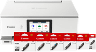 Kijk niet om naar je inktniveau met de Canon PIXMA TS8750 + 1 set extra inkt bundel. Je ontvangt bij je printer nog een extra set cartridges. Print scherpe en kleurrijke foto's met de Canon PIXMA TS8750 zwarte all-in-one printer. Deze printer heeft een afdrukresolutie van 4.800 bij 1.200 dpi, waardoor jouw foto's en documenten scherp op papier staan. De PIXMA TS8750 heeft naast de standaard kleuren ook een fotozwarte en grijze cartridge. Hierdoor print je met meer kleurdiepte en contrast. Daarnaast kopieer en scan je met deze printer. Zo maak je een kopie voor school of scan je een document in. Print automatisch dubbelzijdig en bespaar papier. Je bedient de printer vanaf het touchscreen of via de Canon PRINT app. Door wifi direct is een verbinding via je router niet nodig. Je verbindt jouw apparaat rechtstreeks met het wifi netwerk van de printer. Of verstuur je printopdrachten gemakkelijk via een usb kabel.