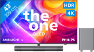 Verbeter het geluid van je televisie met de Philips Ambilight 43'' PUS8000 4K (2025) + Philips TAB6100 tv en soundbar bundel.