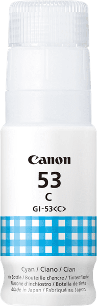 Maak scherpe en heldere afdrukken met het Canon GI-53 Inktflesje Cyaan. Met dit inktflesje print je tot wel 3.800 pagina's in kleur, waardoor je je de komende tijd geen zorgen maakt om nieuwe inkt. Je print blauwtinten. De flessen zijn gemaakt van gerecycled plastic en zijn makkelijk recyclebaar. Is de inktfles leeg? Dan stuur je deze gratis op naar Canon. Bekijk hieronder voor welke printers dit inktflesje geschikt is.